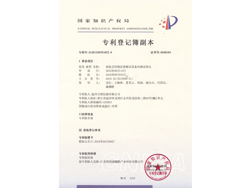 中國發(fā)明專利:熱流式織物涼感測試設備及測試方法(ZL 2015 1 0574661.X)