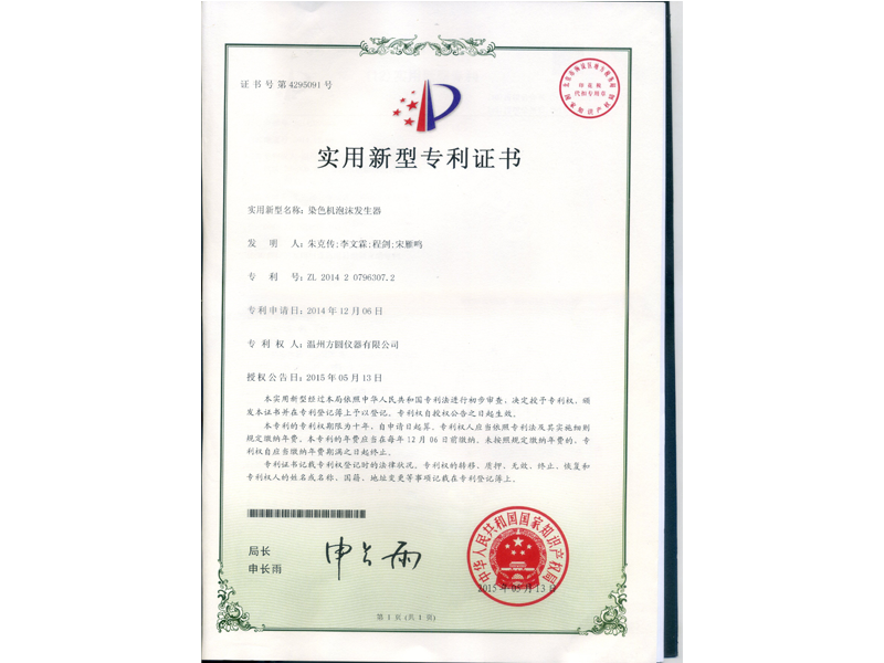 中國實用新型專利:染色機泡沫發(fā)生器(ZL 2014 2 0796307.2)